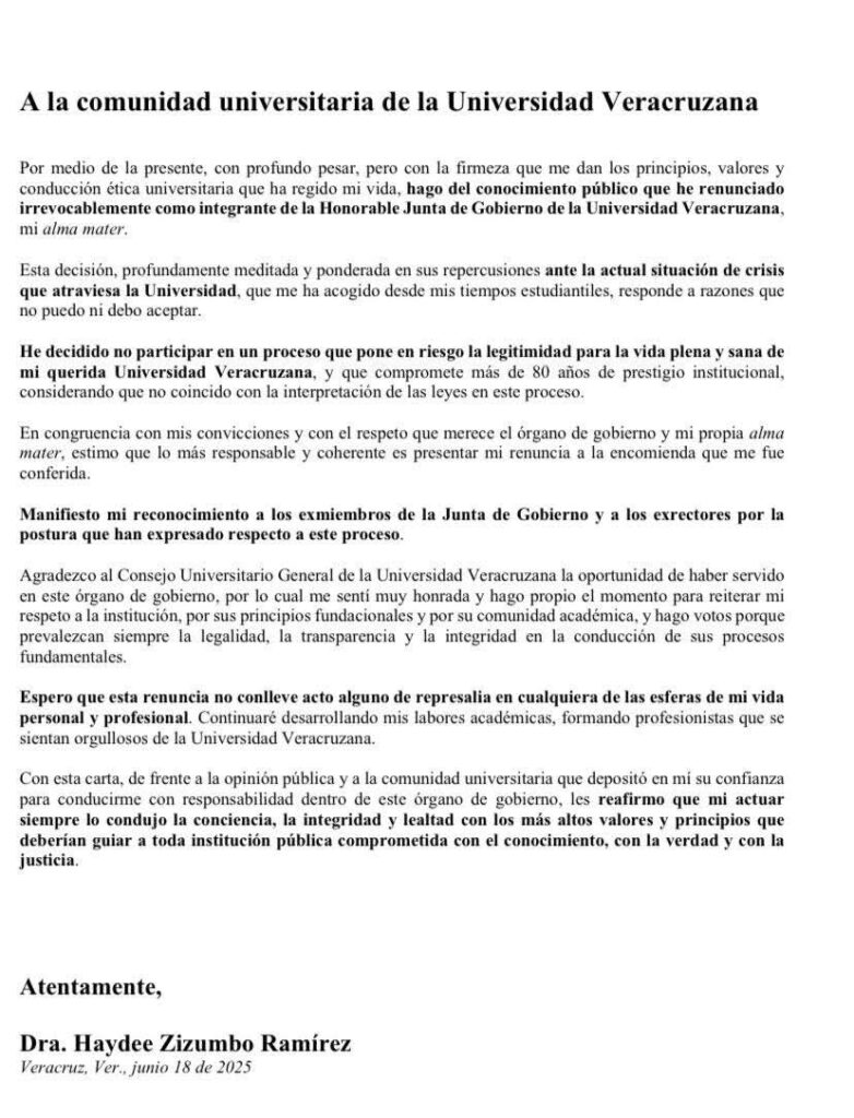 Por medio de la presente, con profundo pesar, pero con la firmeza que me dan los principios, valores y conducción ética universitaria que ha regido mi vida, hago del conocimiento público que he renunciado irrevocablemente como integrante de la Honorable Junta de Gobierno de la Universidad Veracruzana, mi alma mater.