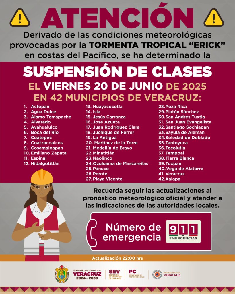 Xalapa, Ver., jueves 19 de junio de 2025. – En seguimiento al comunicado emitido esta noche, la suspensión de clases en Veracruz se amplía a 42 municipios, respecto a la medida inicial para 37, debido a las posibles afectaciones en planteles escolares ocasionadas por las lluvias intensas, inundaciones y deslizamientos provocados por la Tormenta Tropical Erick.