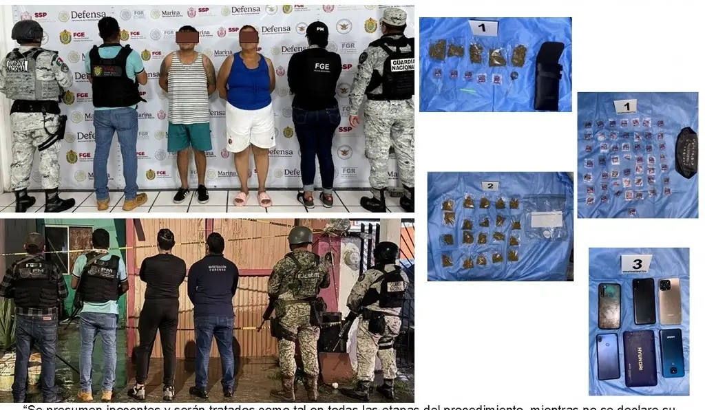 Asimismo, se aseguró el inmueble, hierba seca con características similares a las de la marihuana, polvo blanco granulado con características similares a las del cristal, armas blancas, una motocicleta, bolsas tipo ziploc, una pipa, teléfonos celulares y una tableta electrónica.