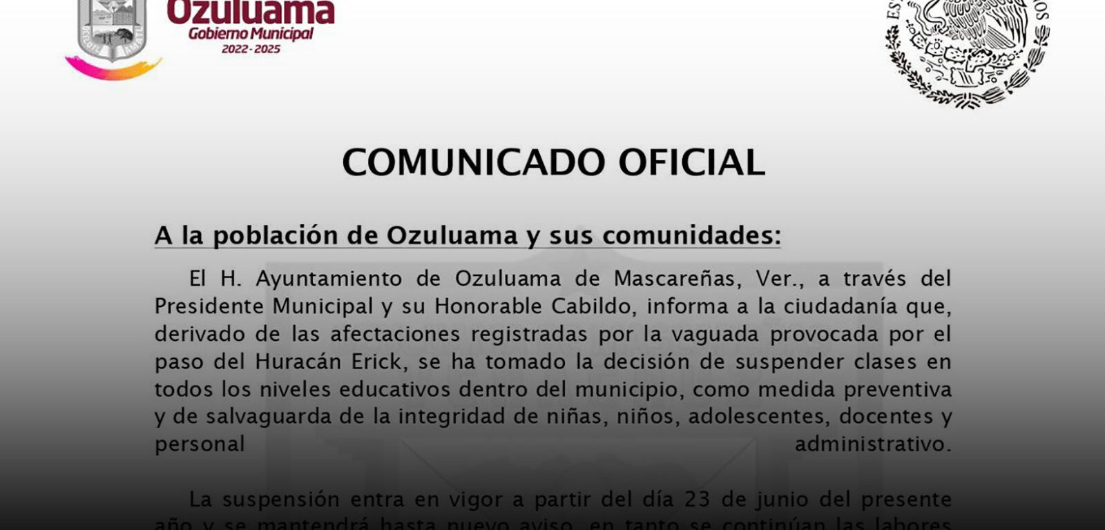 “El H. Ayuntamiento de Ozuluama de Mascareñas, Ver., a través del Presidente Municipal y su Honorable Cabildo, informa a la ciudadanía que, derivado de las afectaciones registradas por la vaguada provocada por el paso del Huracán Erick, se ha tomado la decisión de suspender clases en todos los niveles educativos dentro del municipio, como medida preventiva y de salvaguarda de la integridad de niñas, niños, adolescentes, docentes y personal administrativo”, detalló en comunicado.