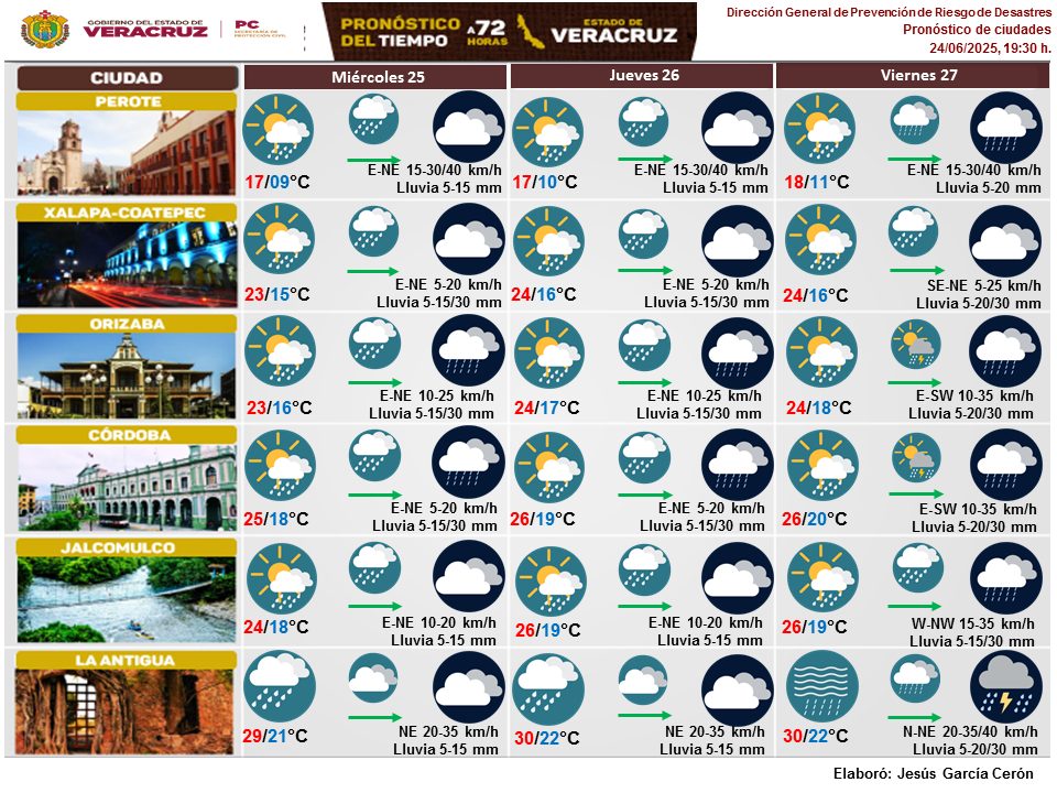 En las próximas 24 horas se prevén lluvias moderadas a ocasionalmente fuertes en el estado de Veracruz con ambiente templado a relativamente caluroso al mediodía y primeras horas de la tarde con viento dominante del Norte, Noreste, Este y Sureste de 20 a 35 km/h con rachas de 45 km/h en costas y mayores en áreas de tormenta.