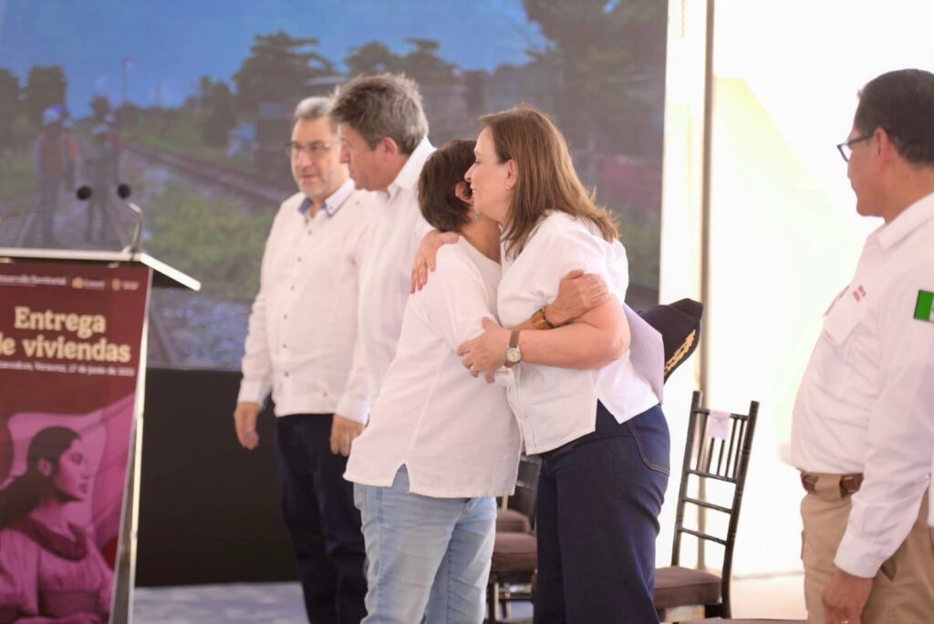 La gobernadora Rocío Nahle García y la secretaria de Desarrollo Agrario, Territorial y Urbano (SEDATU), Edna Elena Vega Rangel, encabezaron la entrega de las llaves de sus nuevas viviendas a Rosa Neri López Pérez y Socorro Jiménez.