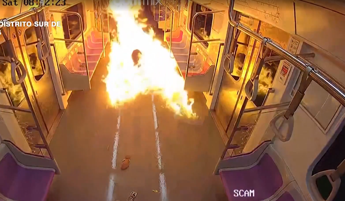 Instantes después, el hombre le prende fuego al combustible y las llamas se apoderan del vagón que luce con pocas personas.