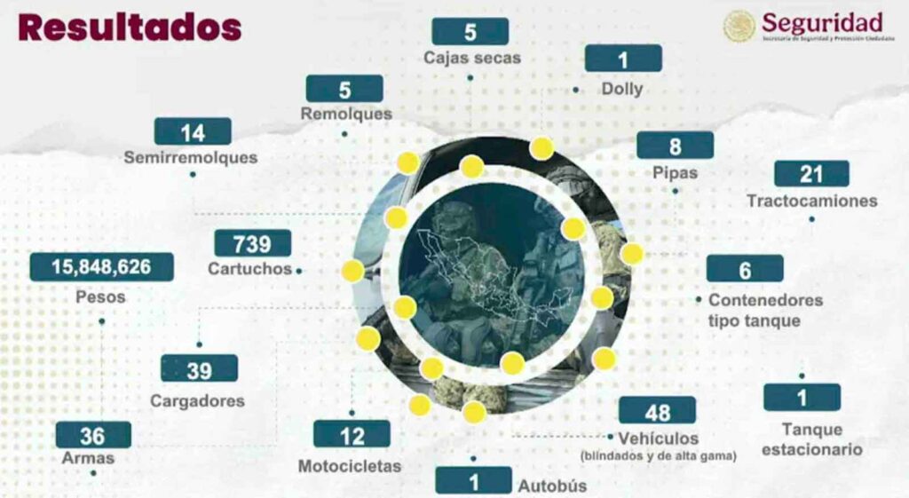 También se aseguraron 36 armas de fuego, 48 vehículos, 21 tractocamiones, 14 contenedores tipo tanque y autotanque, se clausuraron 2 tomas clandestinas, se aseguraron 16 millones de pesos y se rescataron animales exóticos que ya fueron entregados a la Procuraduría Federal de Protección al Ambiente.