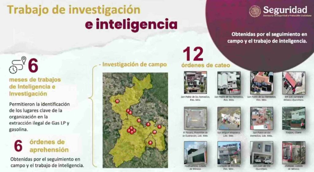 Se realizaron 12 cateos en el Estado de México, CDMX y Querétaro, para cumplimentar 6 órdenes de aprehensión, además de asegurar los patios de maniobra para sustraer, almacenar y distribuir ilícitamente el hidrocarburo.