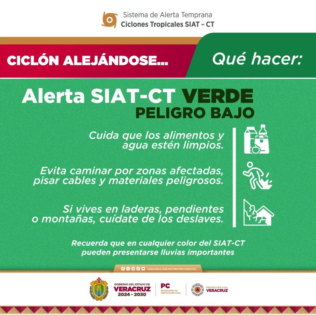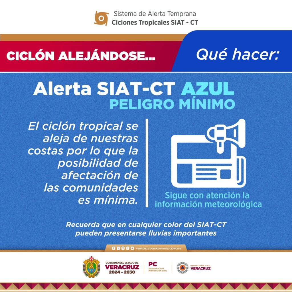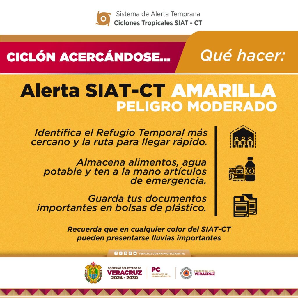 A las 13:30 horas, la Coordinación Nacional de Protección Civil (CNPC) actualizó el alertamiento del Sistema de Alerta Temprana para Ciclones Tropicales (SIAT-CT), activando una Alerta Amarilla (Peligro Moderado) para el norte de Veracruz, por Ciclón Acercándose.