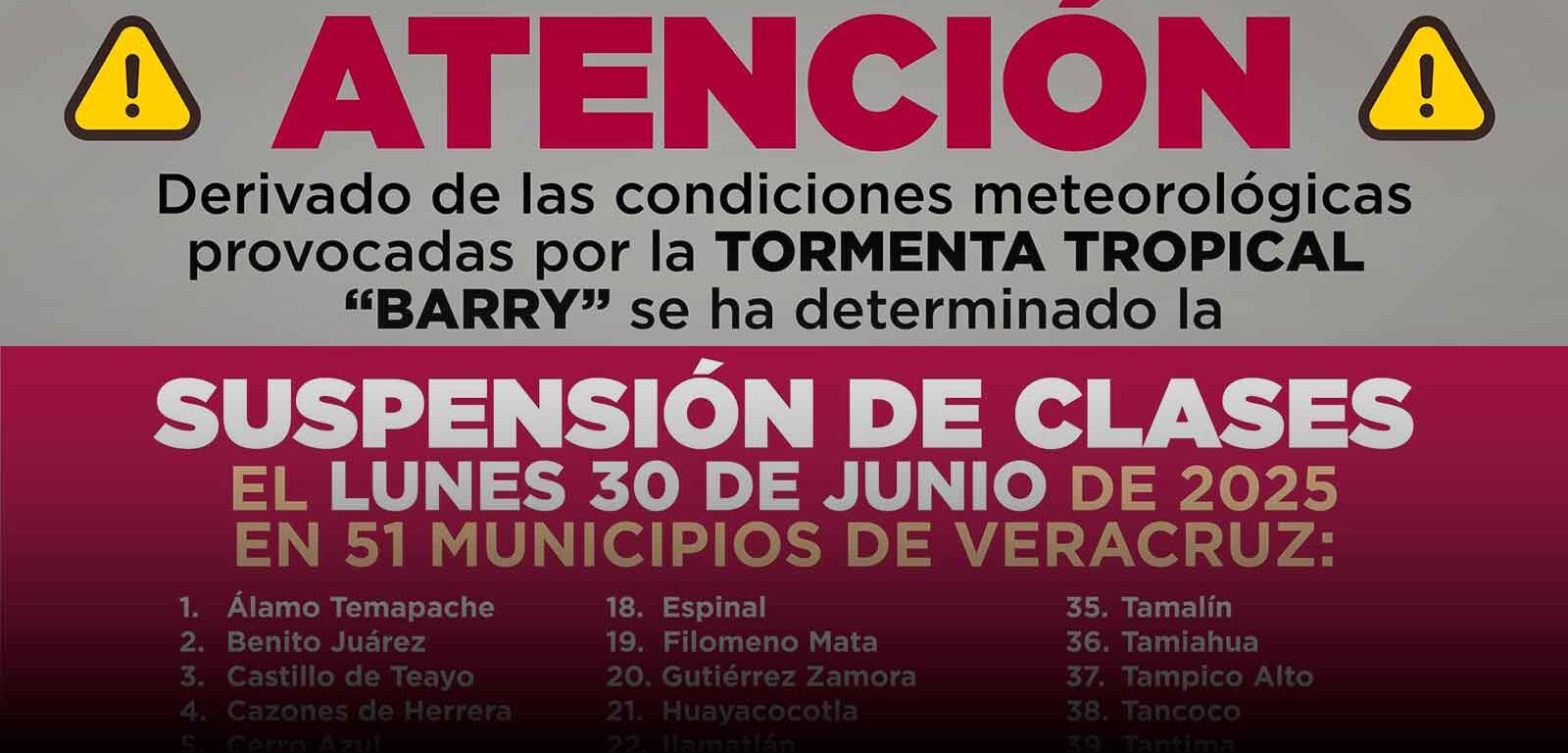 Xalapa, Ver., domingo 29 de junio de 2025. – Debido a los efectos de la Tormenta Tropical Barry, el Gobierno del Estado, a través de las secretarías de Educación y de Protección Civil, determinó suspender las clases y actividades escolares de este lunes, en los turnos matutino y vespertino, en 51 municipios, como medida preventiva.