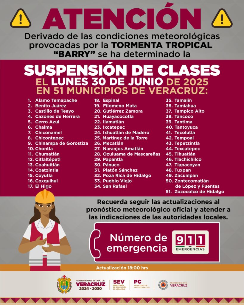 De igual manera, a través de la Secretaría de Educación (SEV) y Protección Civil (PC), informa la suspensión de clases en los turnos matutino y vespertino en los siguientes 51 municipios del norte del estado: