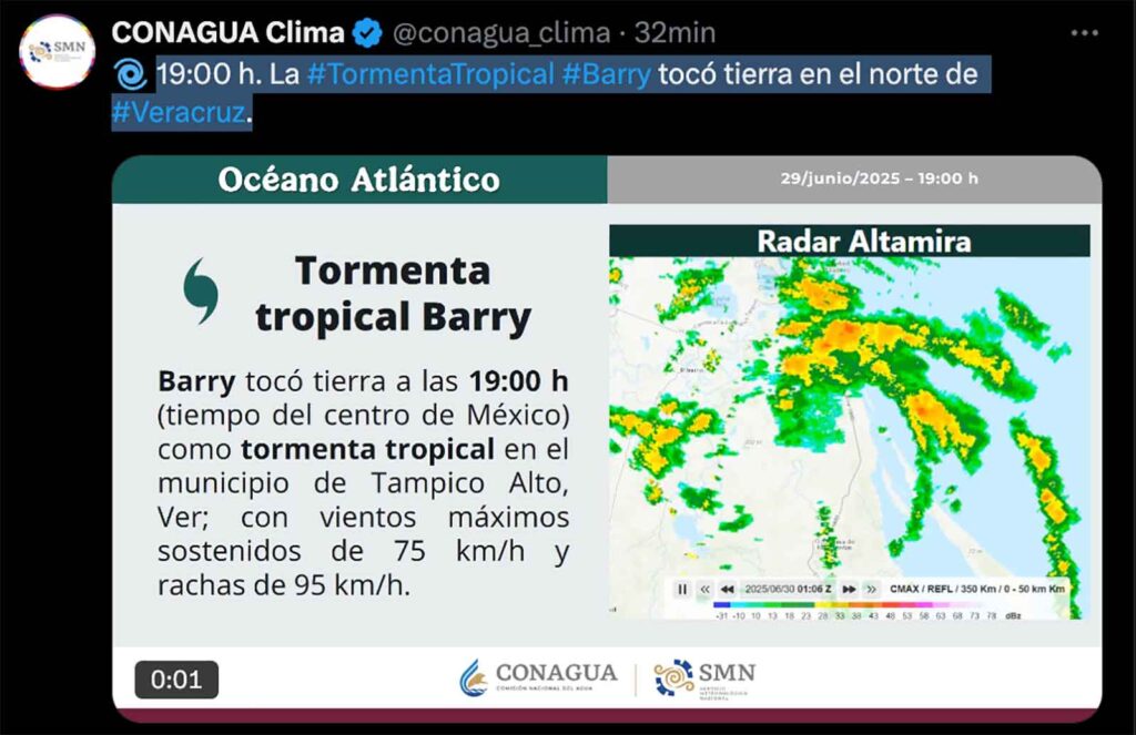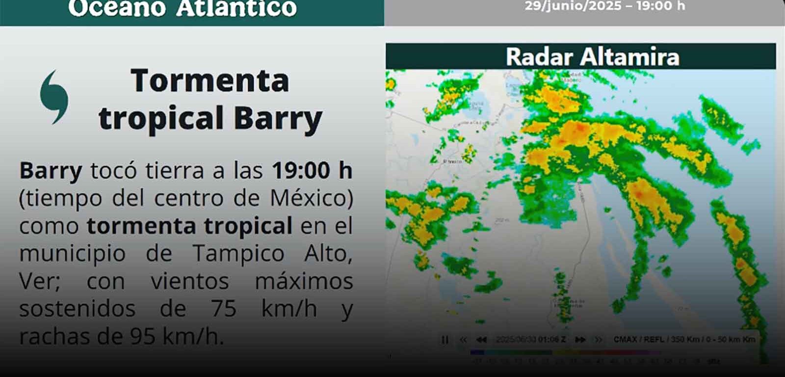 Así lo informó la división de meteorología de la Comisión Nacional del Agua, detallando que “Barry” llegó con vientos máximos sostenidos de 75 km/h y rachas de 95 km/h.