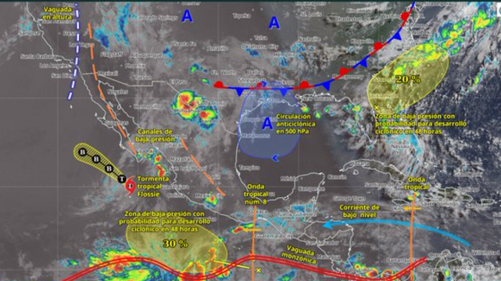 Además, la onda tropical núm. 8 se desplazará frente a las costas de Chiapas y Oaxaca; en asociación con una zona de baja presión con probabilidad para desarrollo ciclónico, y aunado a un canal de baja presión sobre la península de Yucatán y el sureste mexicano, originarán chubascos y lluvias fuertes.