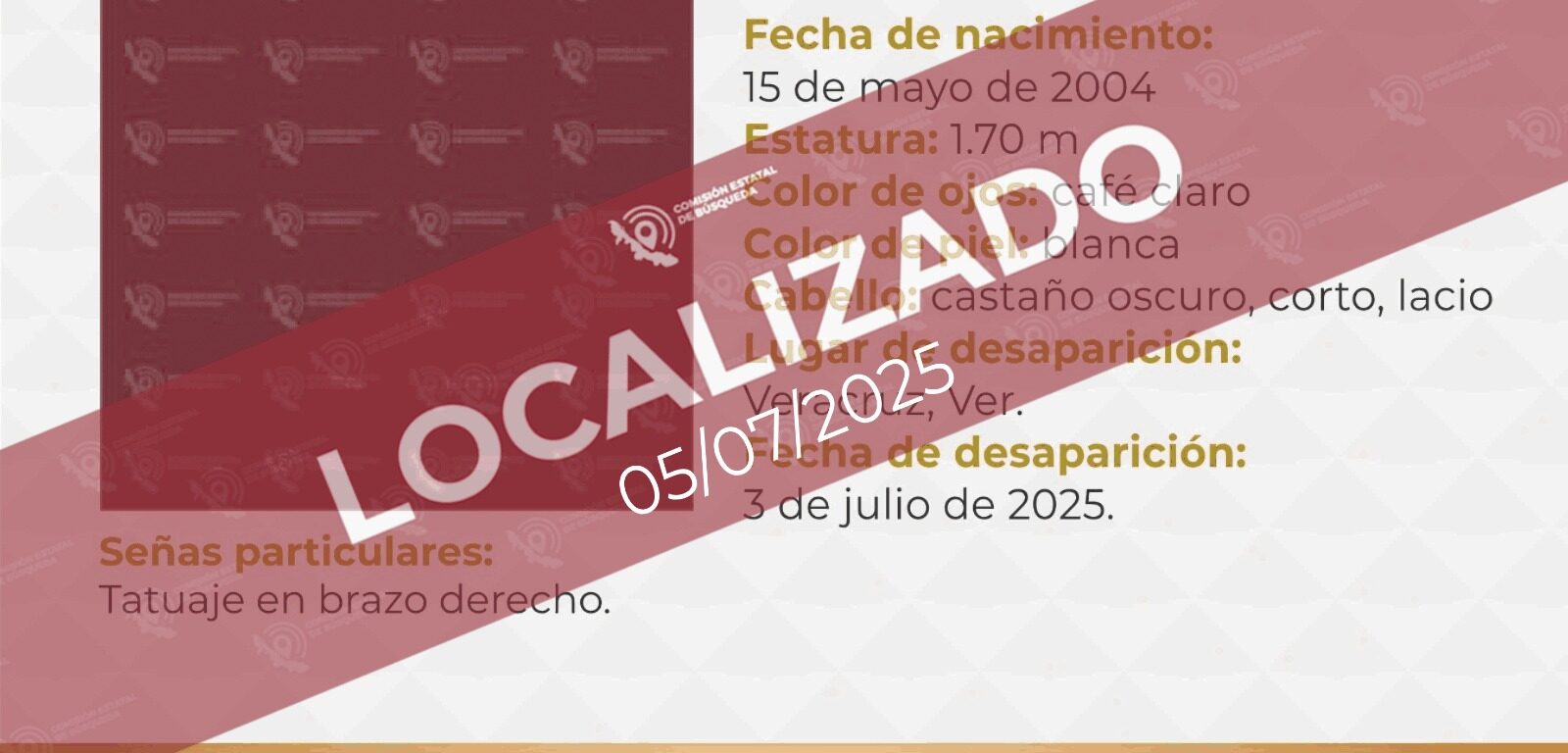 Xalapa, Ver., sábado 05 de julio de 2025.- El Gobierno del Estado, a través de la Comisión Estatal de Búsqueda de Veracruz, informa que ya fueron localizadas, sanas y salvas, las ocho personas reportadas el pasado jueves 03 de julio en el municipio de Veracruz.