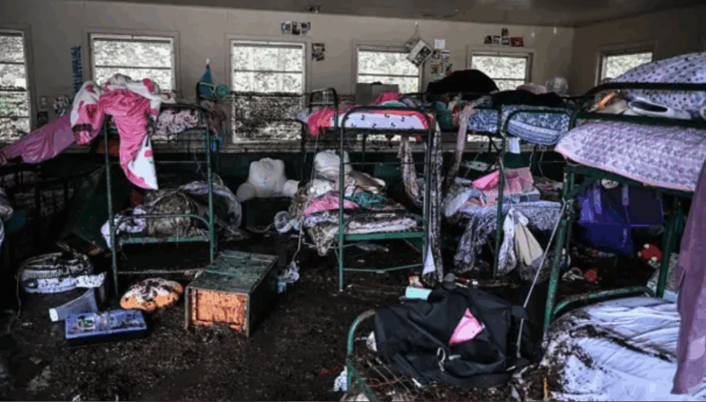 El campamento era un escenario de devastación. En el interior de una cabaña, las líneas de barro que indicaban la altura a la que había subido el agua se encontraban al menos a 1.83 metros del suelo. Había camas, colchones y objetos personales cubiertos de lodo. Algunos edificios tenían ventanas rotas y a uno le faltaba una pared.