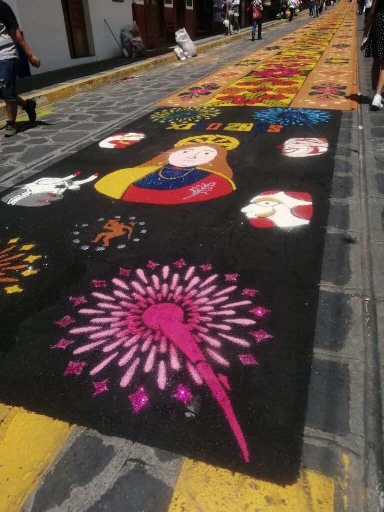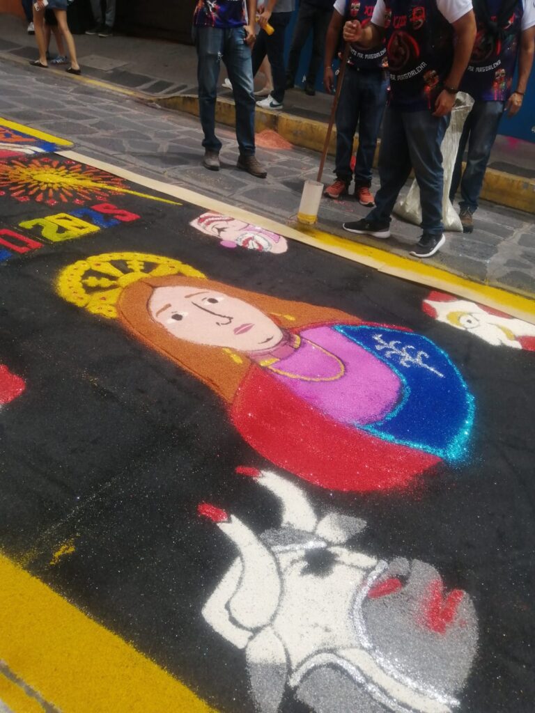 Este año no hubo diseño como tal, pero la alfombra contiene detalles como flores, payasos, danzas e imágenes de la Santa.