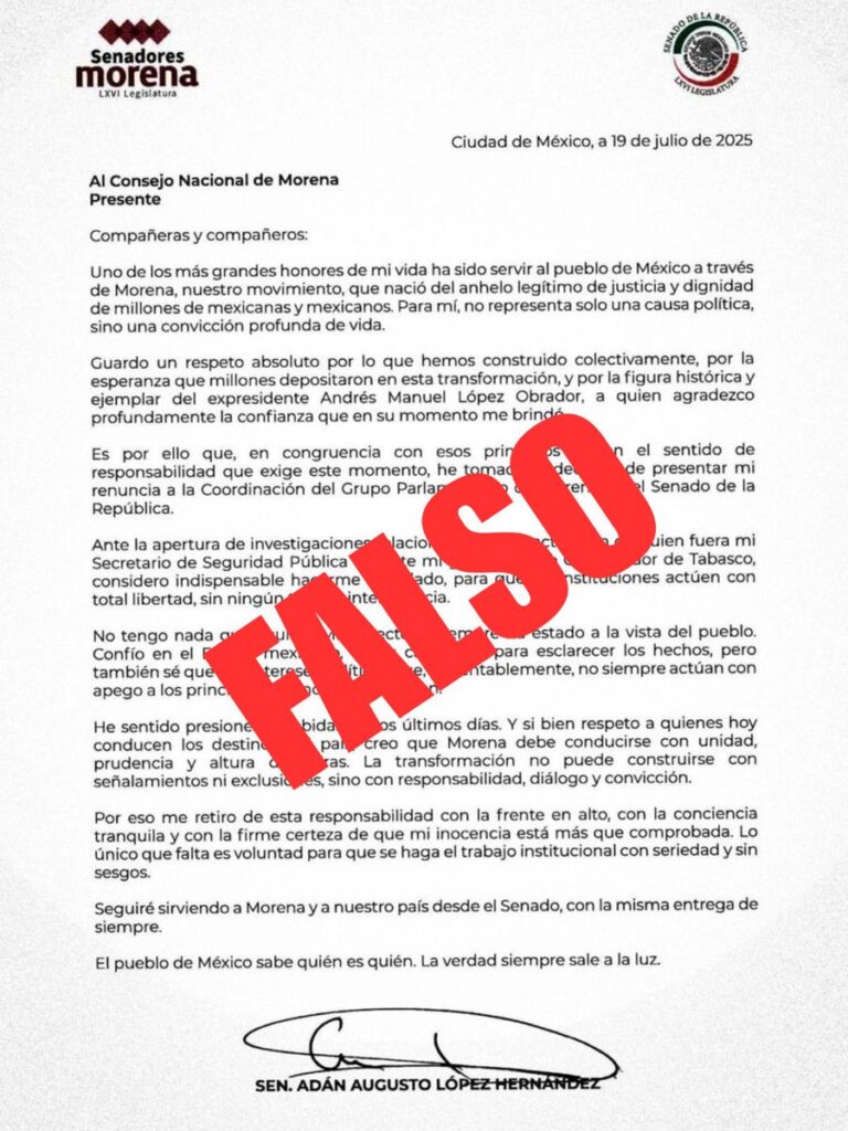 “Totalmente falsa la carta que circula sobre la supuesta renuncia del Senador Adán Augusto como Coordinador de nuestro Grupo Parlamentario; cuando ya no hay remedio, la oposición acostumbra usar la mentira como arma desesperada”, expresó en X.