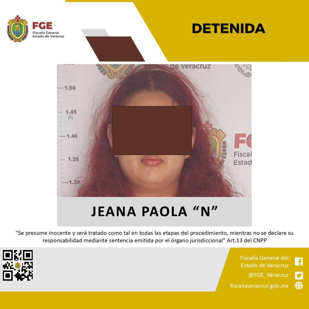 Cerro Azul, ver., 25 de julio de 2025.- La Fiscalía General del Estado informa que, en una segunda acción, derivada de las investigaciones realizadas tras la detención de Víctor Manuel “N” y José Eduardo “N”, presuntos integrantes de un grupo delincuencial, las fuerzas de seguridad en coordinación: Secretaría de la Defensa Nacional, Secretaría de Marina, Secretaría de Seguridad Pública y Policía Ministerial, lograron durante un segundo operativo, la detención de Jeana Paola “N”, quien presuntamente pertenece a la misma célula delictiva.