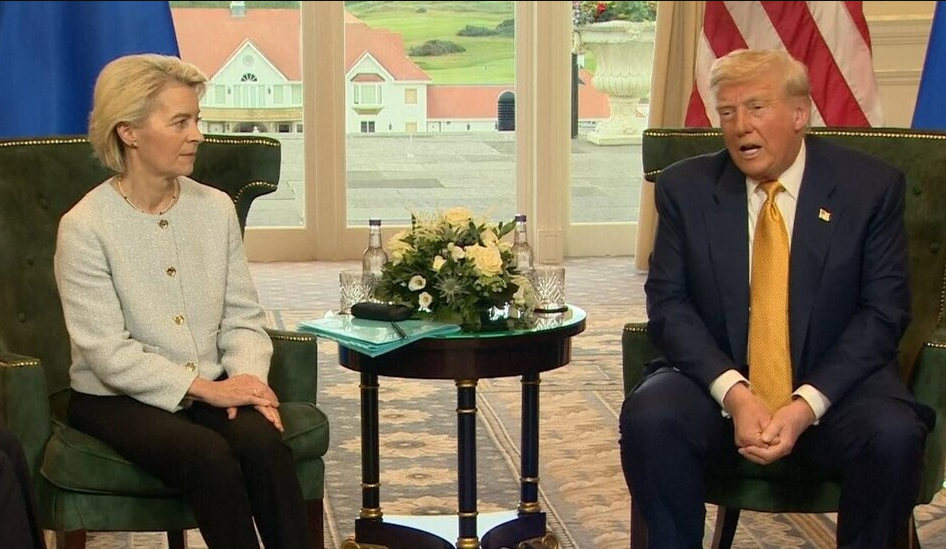La presidenta de la Comisión Europea, Ursula von der Leyen, dijo que el acuerdo incluiría aranceles del 15% en todos los sectores, lo que ayudaría a reequilibrar el comercio entre los dos grandes socios.
