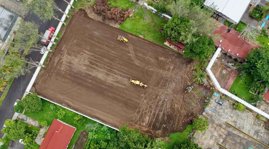 Los trabajos incluyen más de 4 mil metros cuadrados de trazo y nivelación de terreno, más de 200 metros lineales de guarnición de concreto, la aplicación de 700 m³ de base compactada.