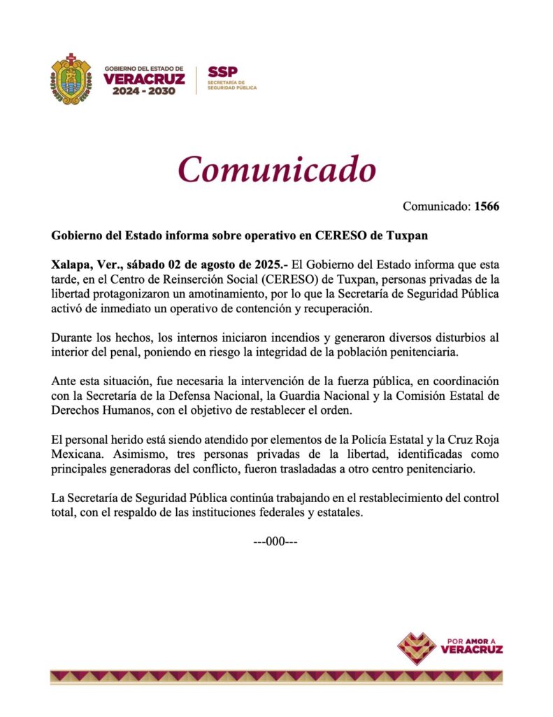 El Gobierno del Estado informa que esta tarde, en el Centro de Reinserción Social (CERESO) de Tuxpan, personas privadas de la libertad protagonizaron un amotinamiento, por lo que la Secretaría de Seguridad Pública activó de inmediato un operativo de contención y recuperación.
