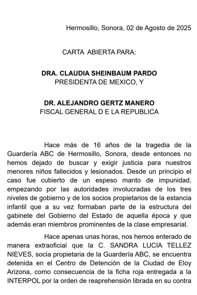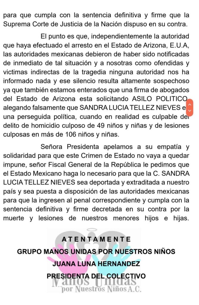 La organización, conformada por familiares de los 49 niños fallecidos y más de 100 lesionados en el incendio ocurrido el 5 de junio de 2009, pidió a la presidenta Claudia Sheinbaum su intervención para garantizar que Téllez Nieves sea extraditada y cumpla con la sentencia definitiva emitida en su contra por la Suprema Corte de Justicia de la Nación (SCJN).