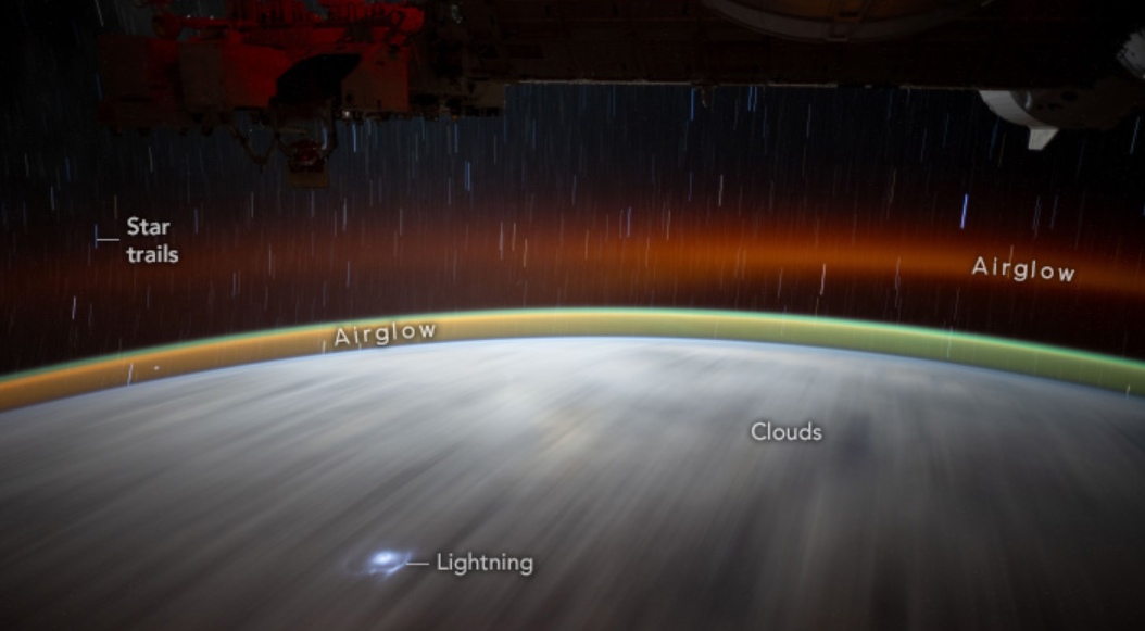 En la imagen, el horizonte brilla con una franja verde intensa provocada por la excitación de moléculas de oxígeno a unos 130 kilómetros de altitud. Encima, una capa rojiza, causada por oxígeno atómico a 240 kilómetros, añade un matiz cálido al paisaje espacial.