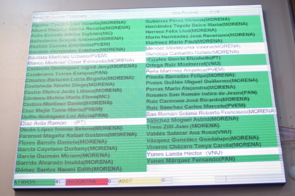 Xalapa, Ver., 14 de agosto de 2025.– Por unanimidad, el Pleno de la LXVII Legislatura aprobó el dictamen de decreto que reforma el artículo 230 BIS del Código Financiero de Veracruz, por el cual los recursos obtenidos por la venta de alimentos en tiendas escolares del sistema público en el Estado sean destinados para la mejora y conservación de la infraestructura física de los mismos y servicios correlacionados.