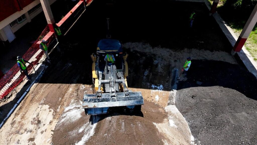 Se nivelarán más de 60 metros cúbicos de base hidráulica, se colocarán 2 piezas de porterías-canastas y postes de voleibol respectivamente. Se pintarán más de 400 metros cuadrados de pintura deportiva antiderrapante.