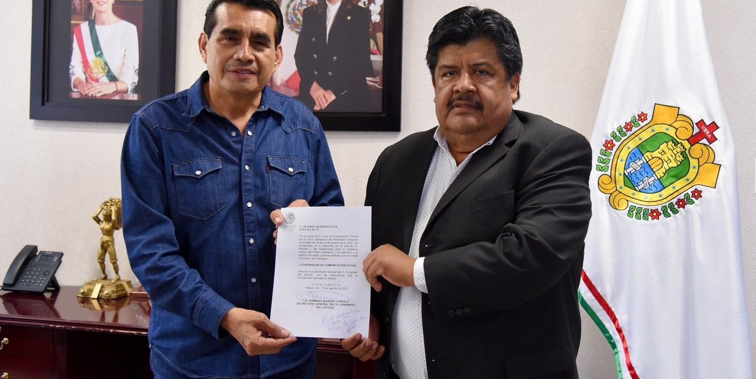 • Entrega el presidente de la Junta de Coordinación Política a Silverio Quevedo Elox nombramiento de coordinador de Comunicación Social.