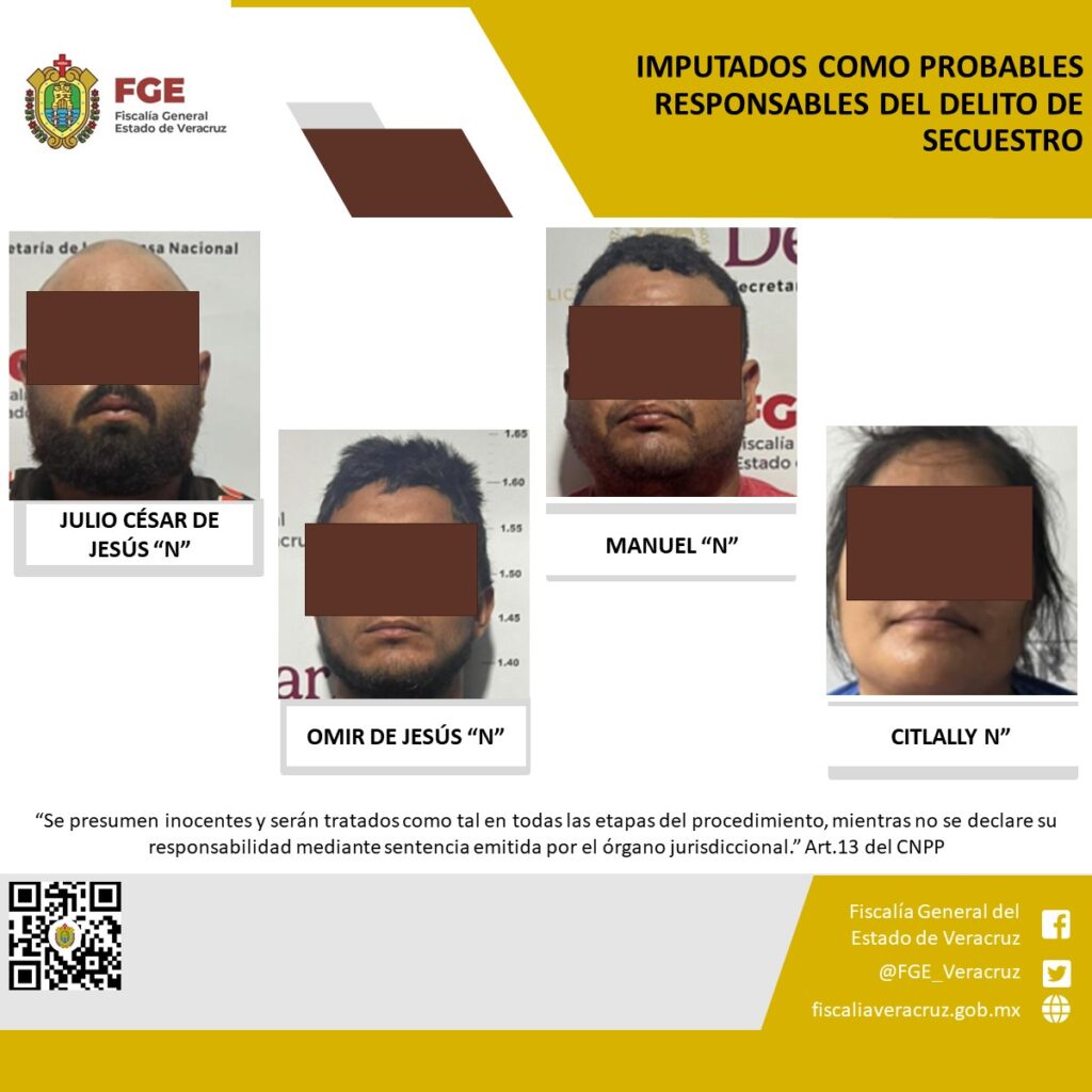 Cosamaloapan, Veracruz, 21 de agosto de 2025.-La Fiscalía General del Estado informa que, la Unidad Especializada en Combate al Secuestro y la Extorsión realizó imputación en contra de Julio César de Jesús “N”, Omir de Jesús “N”, Manuel “N” y Citlally N” como probables responsables del delito de secuestro, cometido en agravio de la víctima identificada con las iniciales D.R.P.