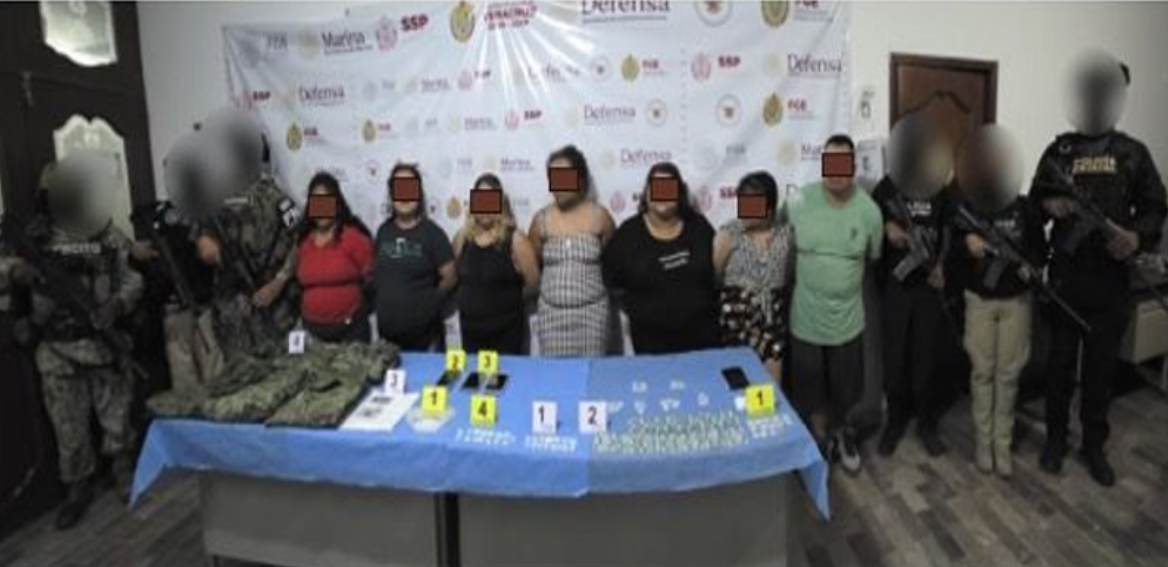 En dicho operativo se detuvo en flagrancia a Hernestina “N”, Angela Jarelin “N”, Librada “N”, Jacqueline “N”, Yamilet “N”, Alma “N” y Vicente “N”. Asimismo, se aseguró una sustancia granulada de color blanco con características similares a las del cristal, teléfonos celulares, tablillas de pastillas, una copia de una identificación de una corporación policial y prendas de ropa con pixeleado militar.