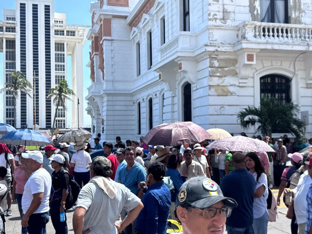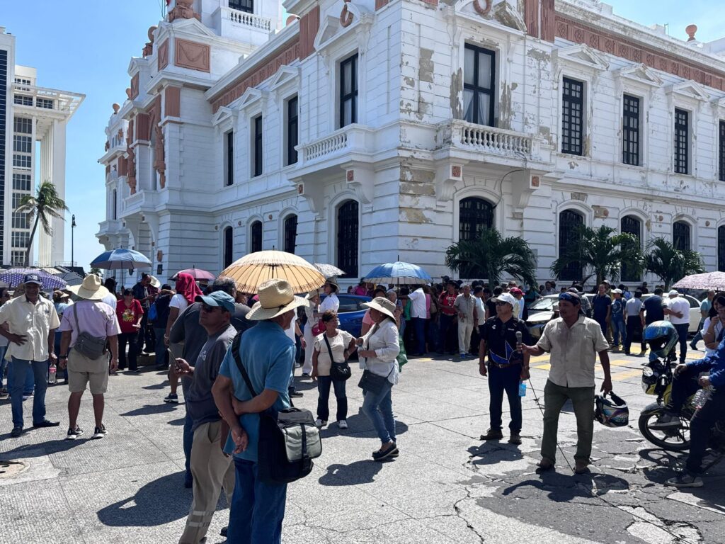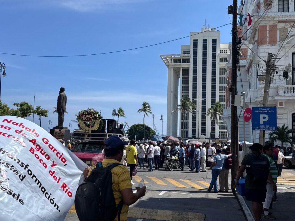 Veracruz, Ver., 08 de septiembre de 2025.- Cientos de ex trabajadores del extinto Sistema de Agua y Saneamiento (SAS), marcharon este lunes en el centro de esta ciudad para exigir la revocación del contrato de concesión al Grupo Metropolitano de Agua y Saneamiento (Grupo MAS), empresa señalada por tarifas elevadas, agua de mala calidad y falta de inversión en infraestructura.