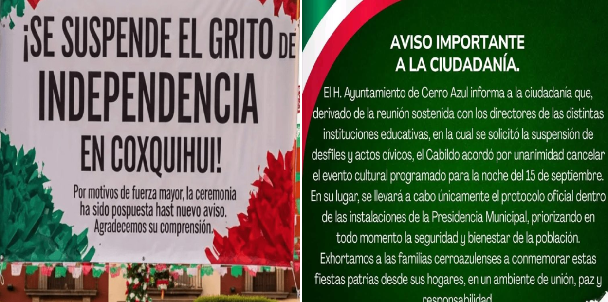 Ayer, el Ayuntamiento de Cerro Azul anunció la cancelación del tradicional Grito y el desfile del día siguiente por el mismo motivo: aumento de la violencia en las últimas semanas. El alcalde Francisco Javier Medina, dijo que el acuerdo se tomó junto con los responsables de las instituciones educativas y no dijo más.