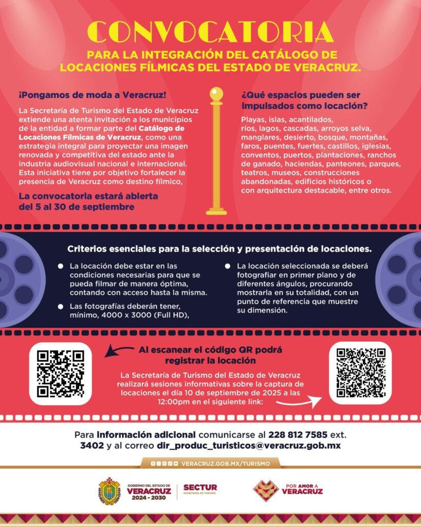 Xalapa, Ver., miércoles 17 de septiembre de 2025.– La Secretaría de Turismo (SECTUR) lanzó la convocatoria para integrar el Catálogo de Locaciones Fílmicas del Estado de Veracruz, como parte de la estrategia para proyectar una imagen renovada y competitiva de la entidad dentro de la industria audiovisual nacional e internacional.