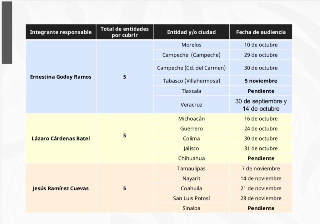 Así lo dio a conocer esta mañana la presidenta Claudia Sheinbaum, quien dio a conocer el calendario de dichas audiencias en todo el país.