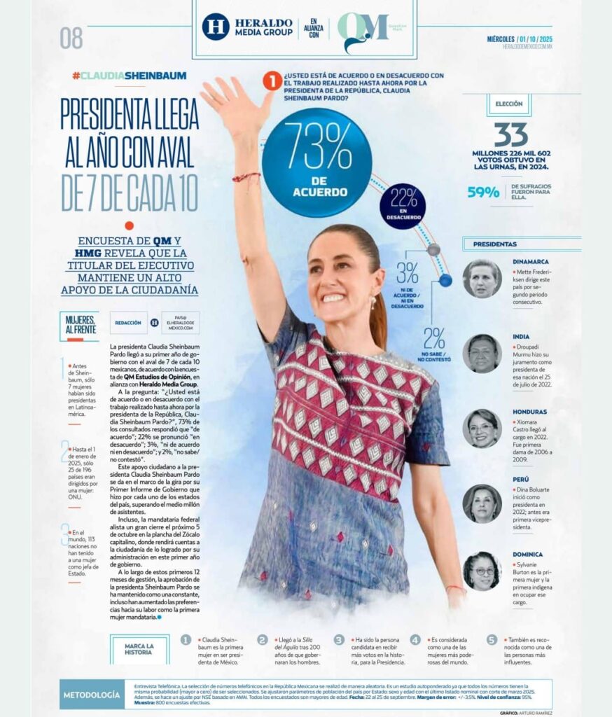 De acuerdo con una encuesta realizada por QM Estudios de Opinión, en alianza con Heraldo Media Group, la Sheinbaum Pardo llegó a su primer año de gobierno con el aval de 7 de cada 10 mexicanos.