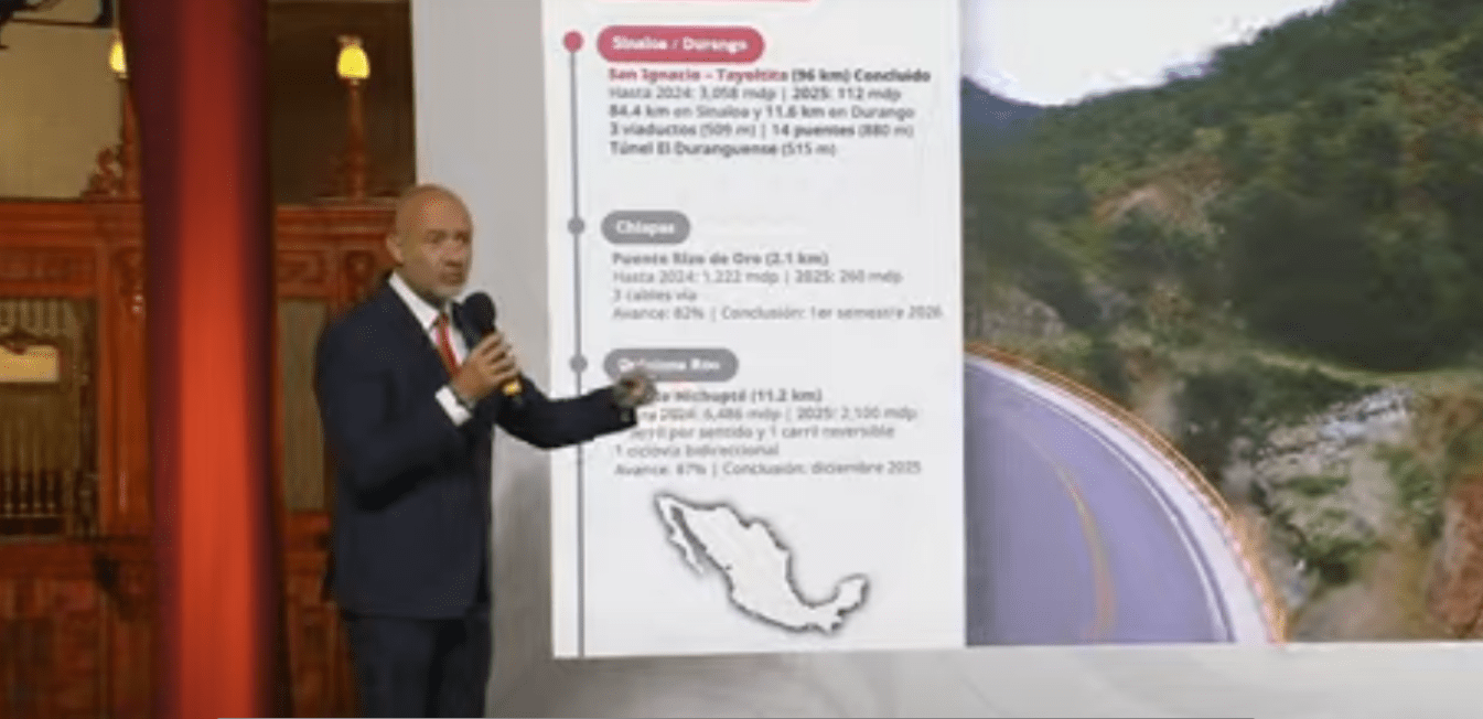 El titular de la SICT anunció que la carretera San Ignacio–Tayoltita, en los estados de Sinaloa y Durango, ya se encuentra concluida y será inaugurada en los próximos días. La obra abarca 96 kilómetros, tres viaductos, 14 puentes y un túnel, con lo que mejora la conectividad en una de las zonas serranas más importantes del noroeste del país.