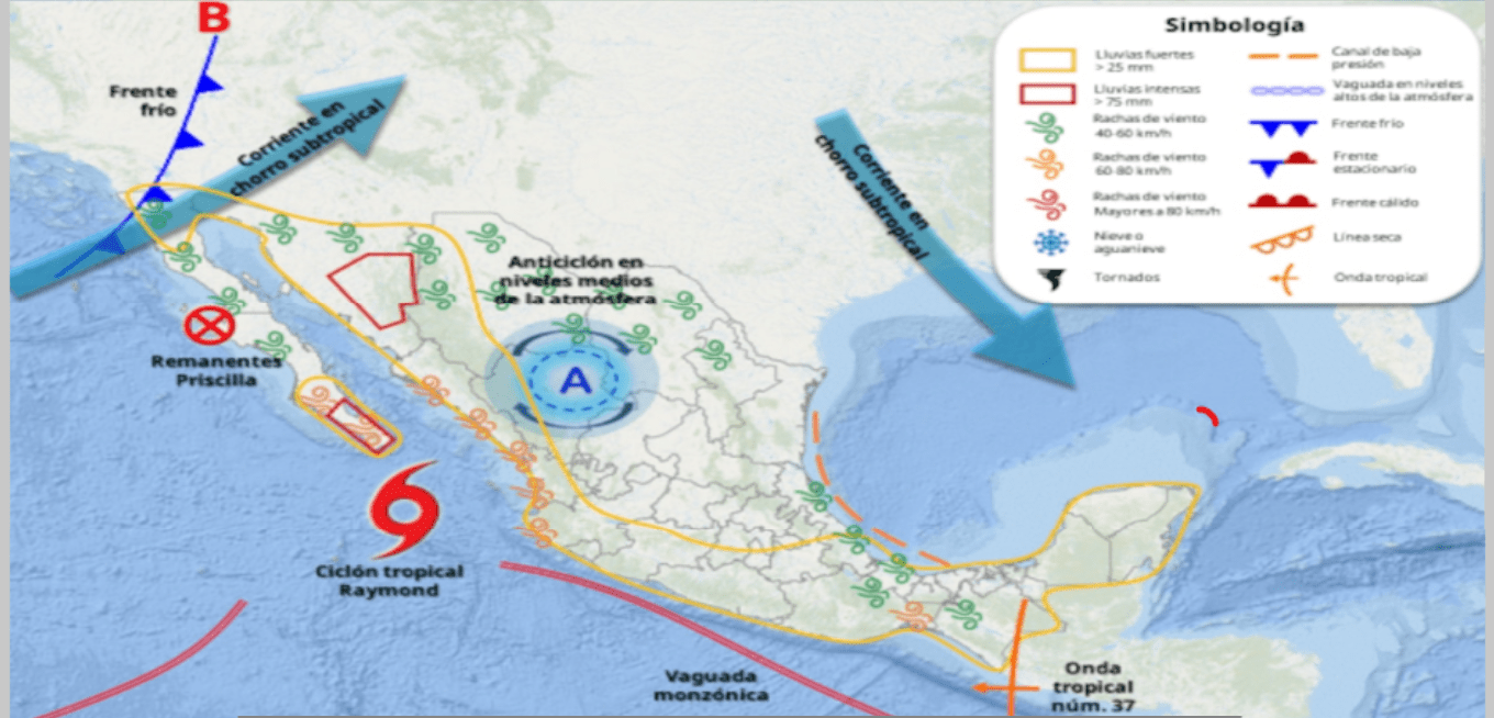 Además, la presencia de un frente frío ingresará por el norte de Baja California, lo cual intensificará las lluvias en el noroeste del país.