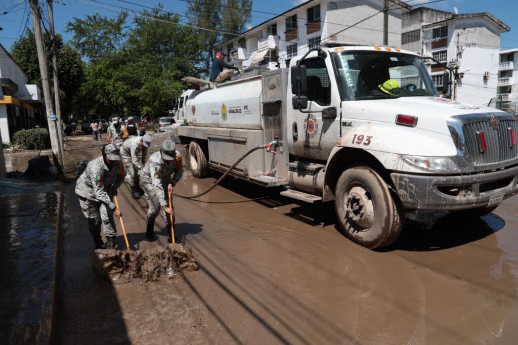 Asimismo, en El Higo se mantienen operativos con lanchas para trasladar a personas hacia resguardos temporales, mientras que en Álamo y Poza Rica avanzan los trabajos de limpieza y restablecimiento de servicios básicos.