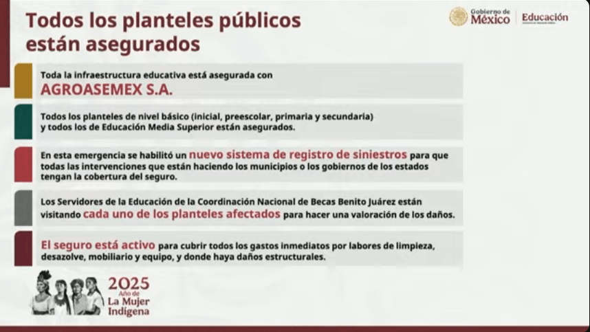 El funcionario destacó que toda la infraestructura educativa pública está asegurada con Agroasemex S.A., por lo que se activó un nuevo sistema de registro de siniestros para garantizar que todas las intervenciones municipales y estatales cuenten con cobertura de seguro.