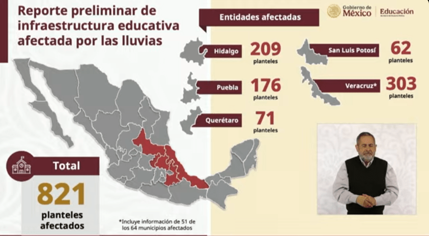 Mario Delgado indicó que Veracruz es la entidad más afectada, con 303 escuelas dañadas y 6,599 planteles con suspensión de actividades, seguidos por Hidalgo con 209 escuelas afectadas, Puebla con 176, Querétaro con 71 y San Luis Potosí con 62.