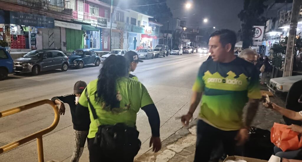 Desde muy temprano, María Elena se instala en la esquina de las calles Bolivia y Encino, donde comparte alimento y palabras de aliento a los peregrinos que llegan a pie desde distintas regiones del estado y de comunidades cercanas.