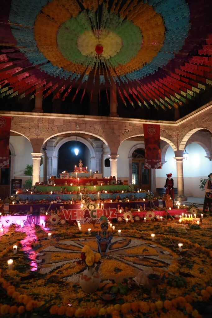 El acto continuó con el corte de listón del Altar Monumental de Veracruz, instalado en el Palacio de Gobierno bajo la dirección del artista Joaquín Miranda Portillo; está dividida en dos secciones —una prehispánica y otra de la región Capital— elaboradas con semillas y elementos naturales que evocan los cuatro elementos: tierra, agua, aire y fuego, así como los siete niveles que el alma recorre hacia el Mictlán.