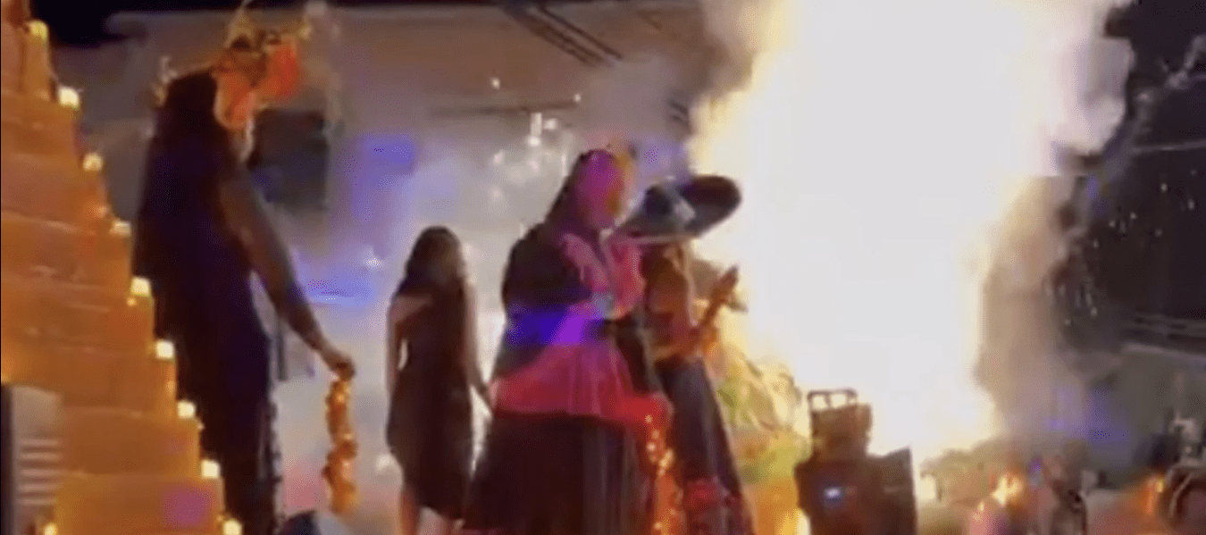 En un video que se hizo viral en redes sociales, se aprecia a un tractor que transportaba una plataforma decorada con motivos alusivos al Día de Muertos. Aparentemente una chispa encendió la pirotecnia que formaba parte del carro alegórico, lo que derivó en una fuerte estallido.