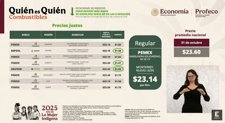 De acuerdo con el informe de la Profeco, comprendido con el monitoreo que se realizó de la semana del 20 al 26 de octubre del 2025, el precio más bajo a nivel nacional de la gasolina Regular o Magna, fue de 23.60 pesos.