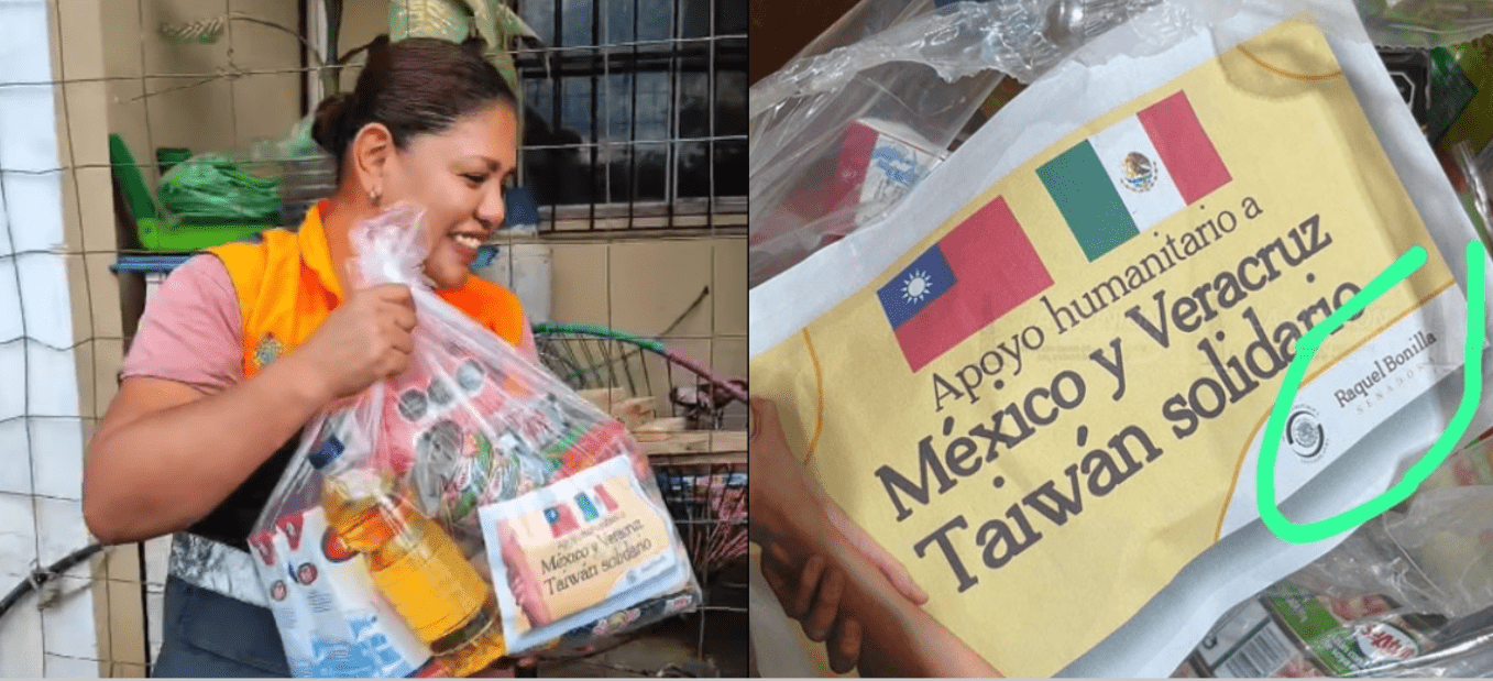 En bolsas de plástico muy bien surtidas se puede ver una etiqueta con las banderas de Taiwán y México sobre la leyenda “Apoyo humanitario a México y Veracruz. Taiwán solidario”. Y en la parte inferior derecha el nombre de la senadora de Morena, Raquel Bonilla Herrera.