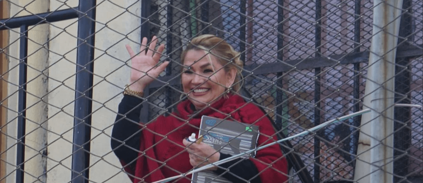 La exmandataria transitoria salió por la puerta principal del Centro de Orientación Femenina de Miraflores en La Paz, con una bandera de Bolivia en la mano y acompañada por sus hijos Carolina y José Armando Ribera.