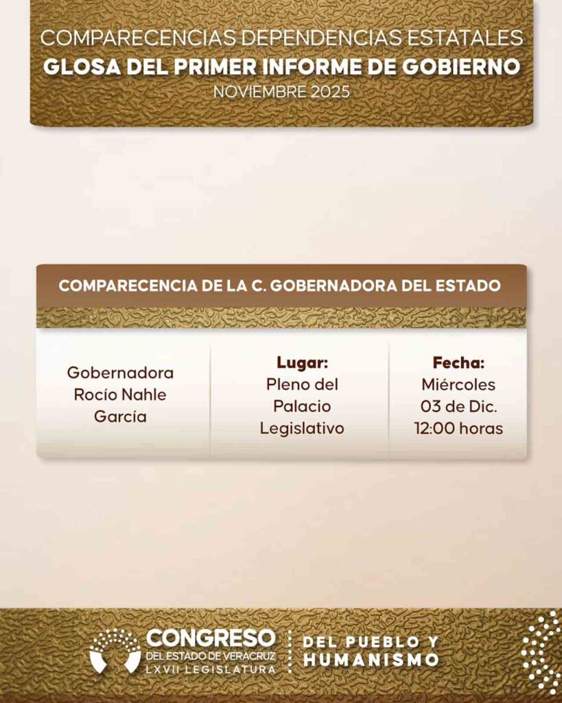 Para efectos del cumplimiento con lo dispuesto en el Artículo 49 constitucional, la comparecencia de la gobernadora del estado, Rocío Nahle García, está programada para el miércoles 3 de diciembre a las 12:00 horas, ante el Pleno legislativo.