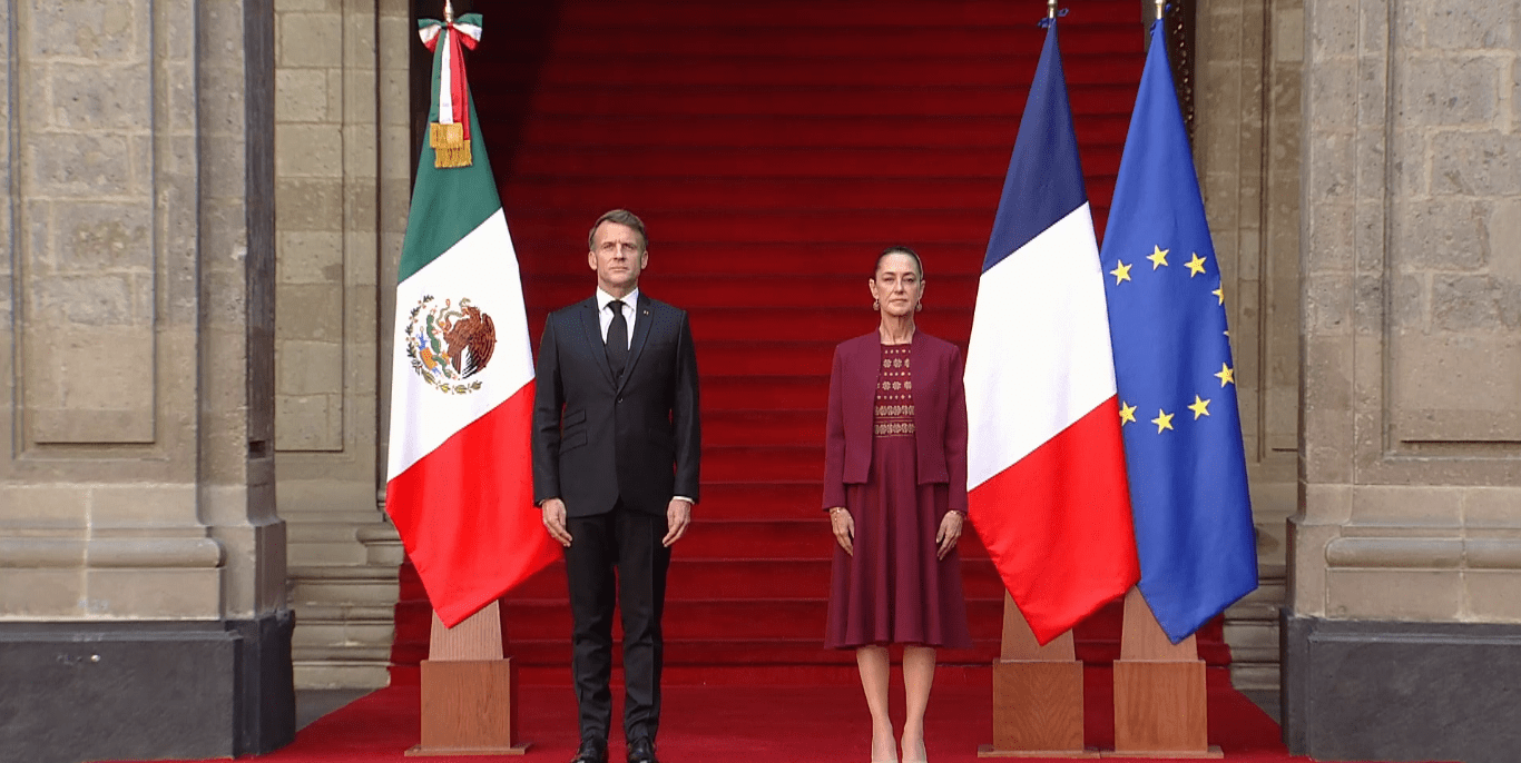 Claudia Sheinbaum recibió al presidente de Francia, Emmanuel Macron, con quien abordará el recibimiento de un códice de una canción europea, así como del acuerdo comercial que se renovará en 2026 con la Unión Europea (UE).