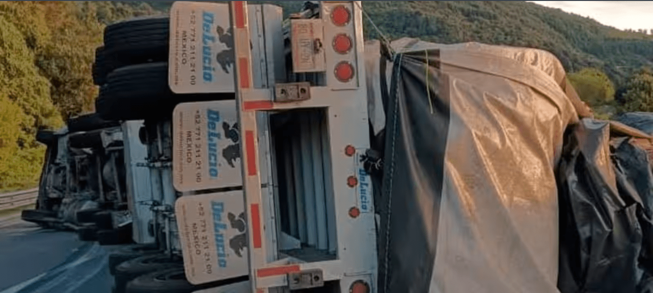 De acuerdo con los primeros reportes, el tractocamión que arrastraba una plataforma cargada con bobinas de papel habría sufrido una falla mecánica, lo que ocasionó que el operador perdiera el control y la unidad terminara volcada sobre su costado derecho, obstruyendo ambos carriles de descenso poco antes de la zona de túneles conocida como “Esperanza”.