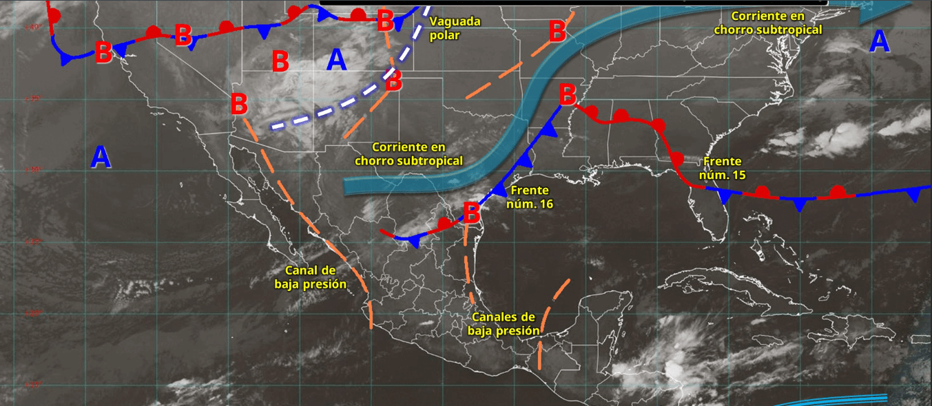 Para hoy, el frente núm. 16 se extenderá sobre el norte y noreste de México, y en interacción con la corriente en chorro subtropical y con un canal de baja presión, ocasionará lluvias puntuales fuertes con descargas eléctricas en Nuevo León y Tamaulipas, así como chubascos en Coahuila y San Luis Potosí.