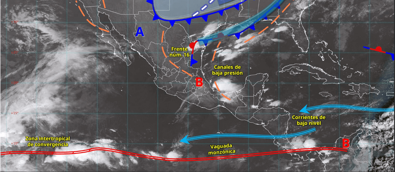 Este miércoles, el frente frío número 16 se verá reforzado por una masa de aire polar, lo que generará condiciones meteorológicas severas a su paso por el noreste y oriente de México. De acuerdo con el pronóstico, el sistema frontal interactuará con un canal de baja presión ubicado sobre el suroeste del Golfo de México y el sureste del país, propiciando lluvias fuertes a muy fuertes en estas regiones, incluida la península de Yucatán.